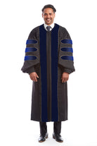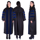 La bata de doctorado para graduados universitarios seleccionados presenta elegantes mangas acampanadas y está adornada con galones de terciopelo azul meticulosamente colocados. Los paneles frontales están adornados con el mismo rico terciopelo azul, rindiendo homenaje a la tradición consagrada de la clásica bata de doctorado. También se construyen dos bolsillos laterales para permitir un fácil acceso a sus pertenencias. Todos nuestros vestidos de ceremonia cumplen con las especificaciones registradas en la Oficina Intercolegial de Vestuario Académico.