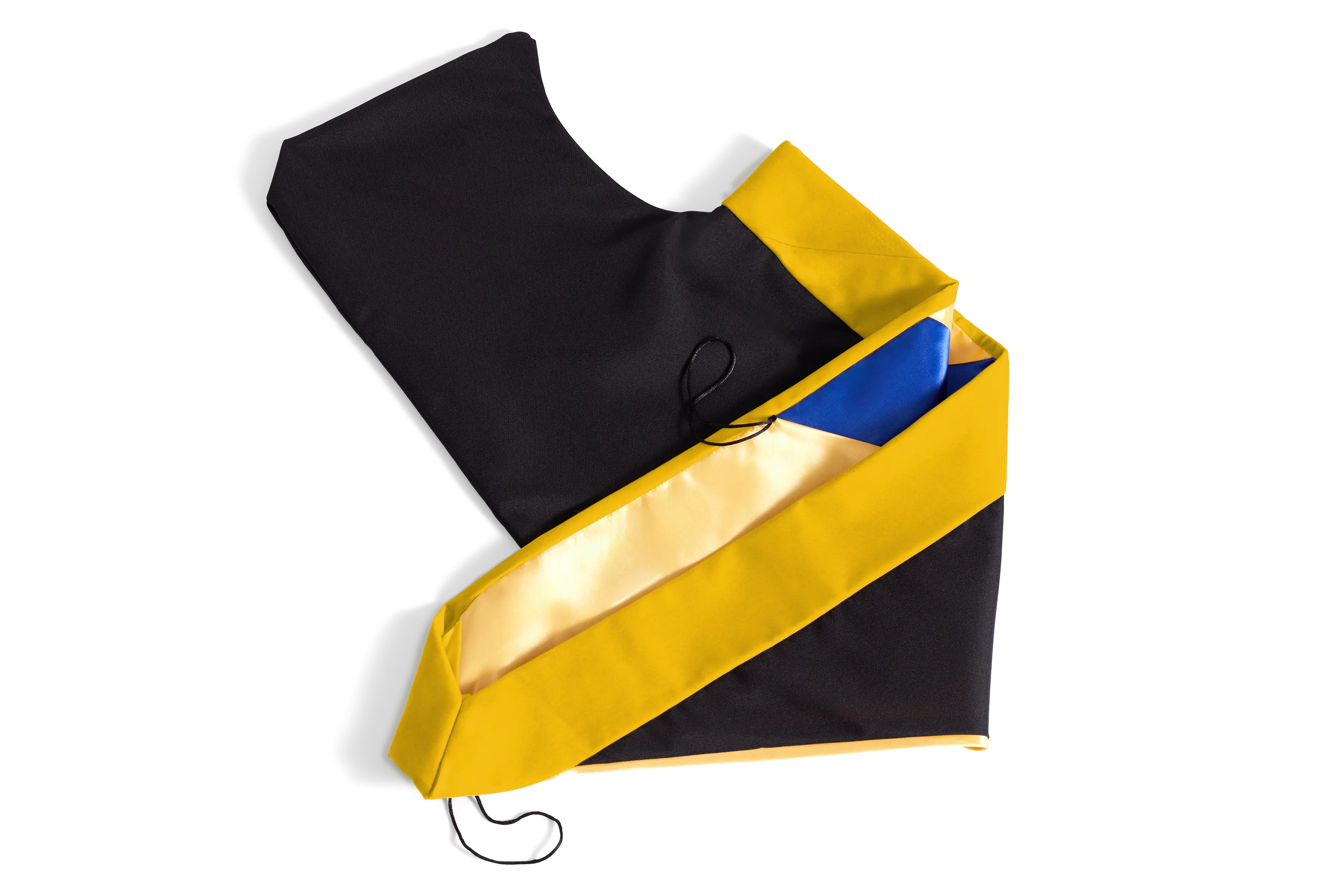 Doctoral graduates step into UC San Francisco’s most prestigious attire: tailored crepe black gowns accented with gold piping, plush blue velvet front panels, and three blue velvet chevrons on each bell sleeve. The doctoral hood, lined in UC San Francisco’s signature colors of luminous gold satin with a bold UC blue chevron, is trimmed in velvet to denote each discipline—Ph.D. blue, JD purple, MD green. The ensemble is completed with an eight-sided blue velvet tam, adjustable for fit, and a gold bullion tassel for an added touch of prestige. Each regalia set includes a garment bag and carrying case, supporting not just commencement but a lifetime of ceremonial use, from Hooding in Herbst Theatre to future convocations and commencements.