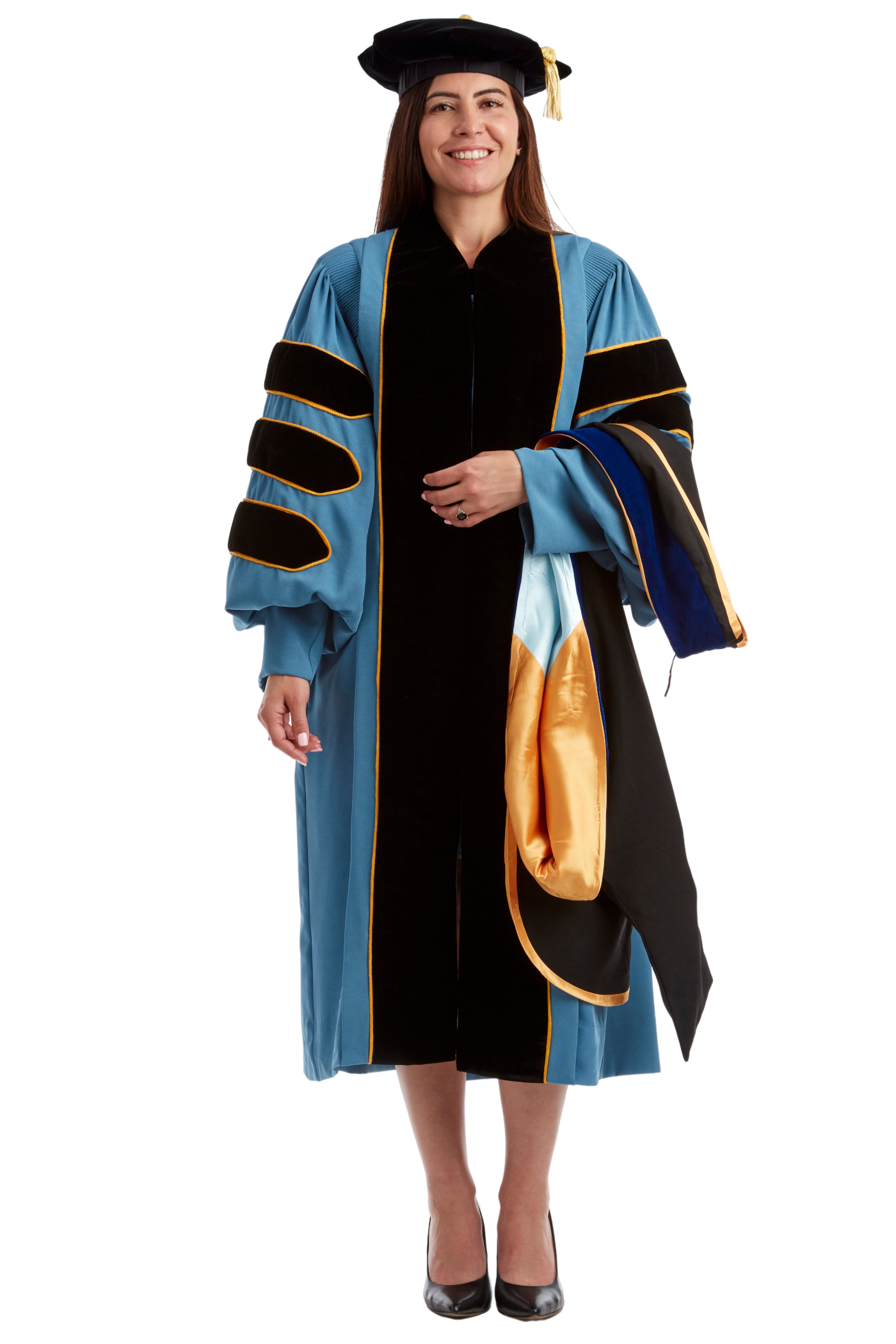 Doctoral graduates step into the University of Michigan’s most prestigious attire: tailored crepe light blue gowns accented with maize piping, plush black velvet front panels, and three black velvet chevrons on each bell sleeve. The doctoral hood, lined in Michigan’s signature colors of luminous maize with a UMich blue chevron, is trimmed in velvet to denote each discipline—Ph.D. blue and MD green. The ensemble is completed with an eight-sided black velvet tam, adjustable for fit, and a gold bullion tassel for an added touch of prestige. Each regalia set includes a garment bag and carrying case, supporting not just commencement but a lifetime of ceremonial use, from Hooding in Hill Auditorium to future convocations and commencements.