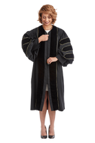 The doctoral gown for the Texas Lutheran University showcases elegant bell sleeves and is embellished with meticulously placed black velvet chevrons. The front panels are graced with the same rich black velvet, paying homage to the time-honored tradition of the classic Doctoral Gown. Two side pockets are also constructed to allow easy access to your belongings. All our ceremonial gowns meet the Texas Lutheran University specifications registered with the Intercollegiate Bureau of Academic Costume.