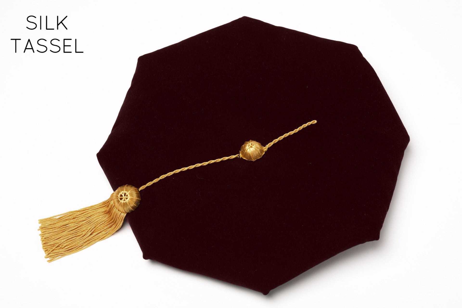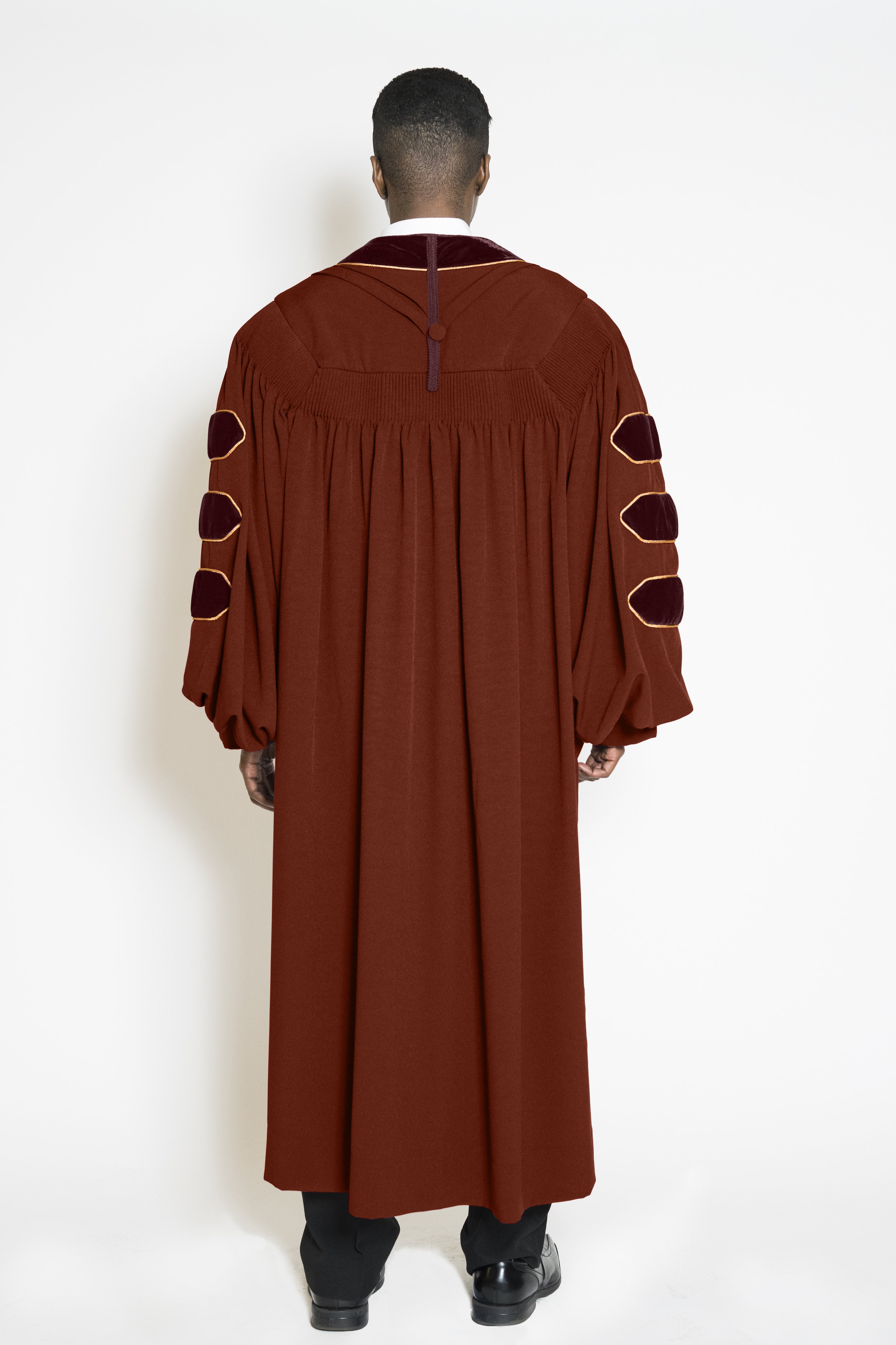 The doctoral gown for the University of Texas at Austin showcases elegant bell sleeves and is embellished with meticulously placed camel velvet chevrons. The front panels are graced with the same camel black velvet, paying homage to the time-honored tradition of the classic Doctoral Gown. Two side pockets are also constructed to allow easy access to your belongings. All our ceremonial gowns meet the Johns Hopkins University specifications registered with the Intercollegiate Bureau of Academic Costume.