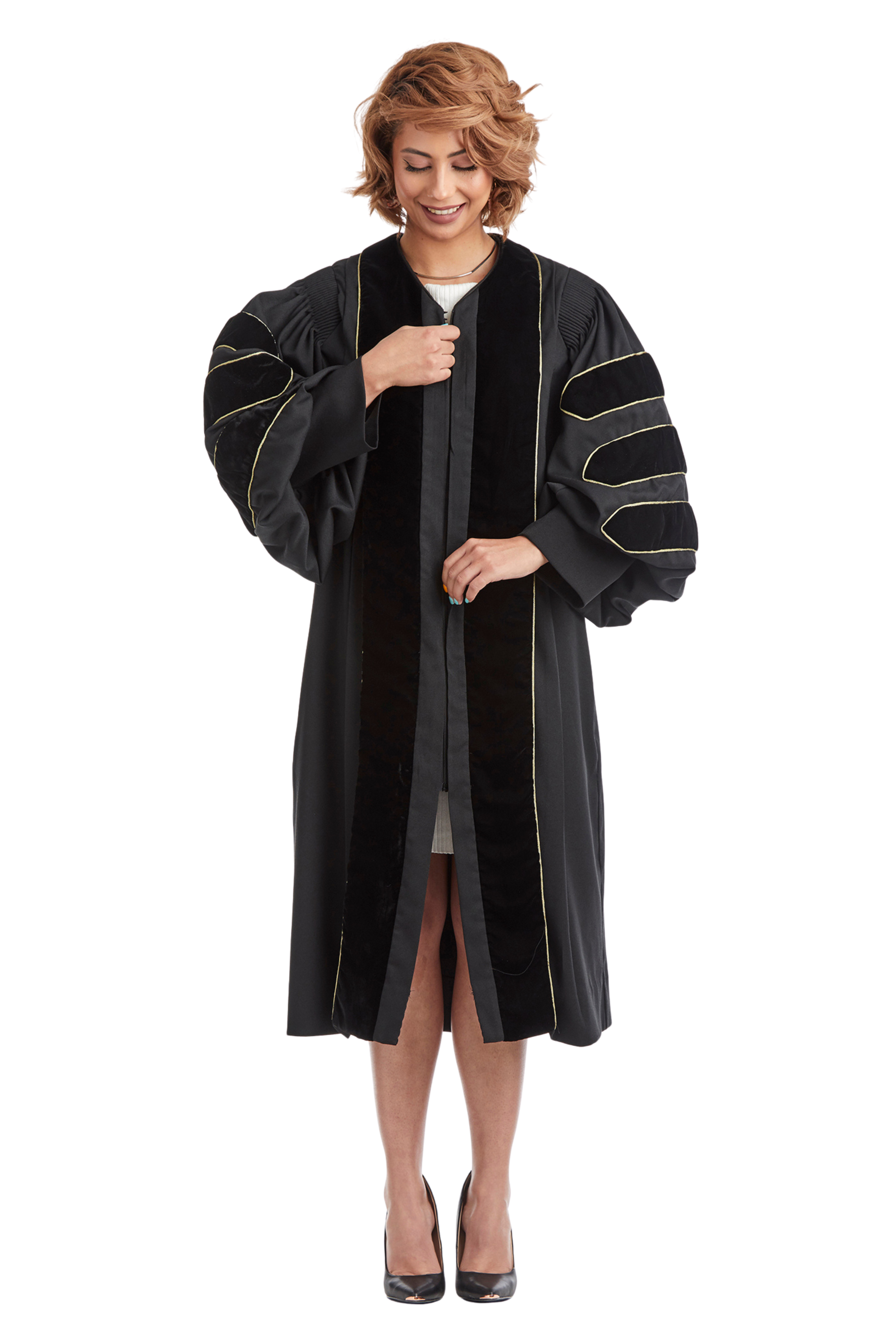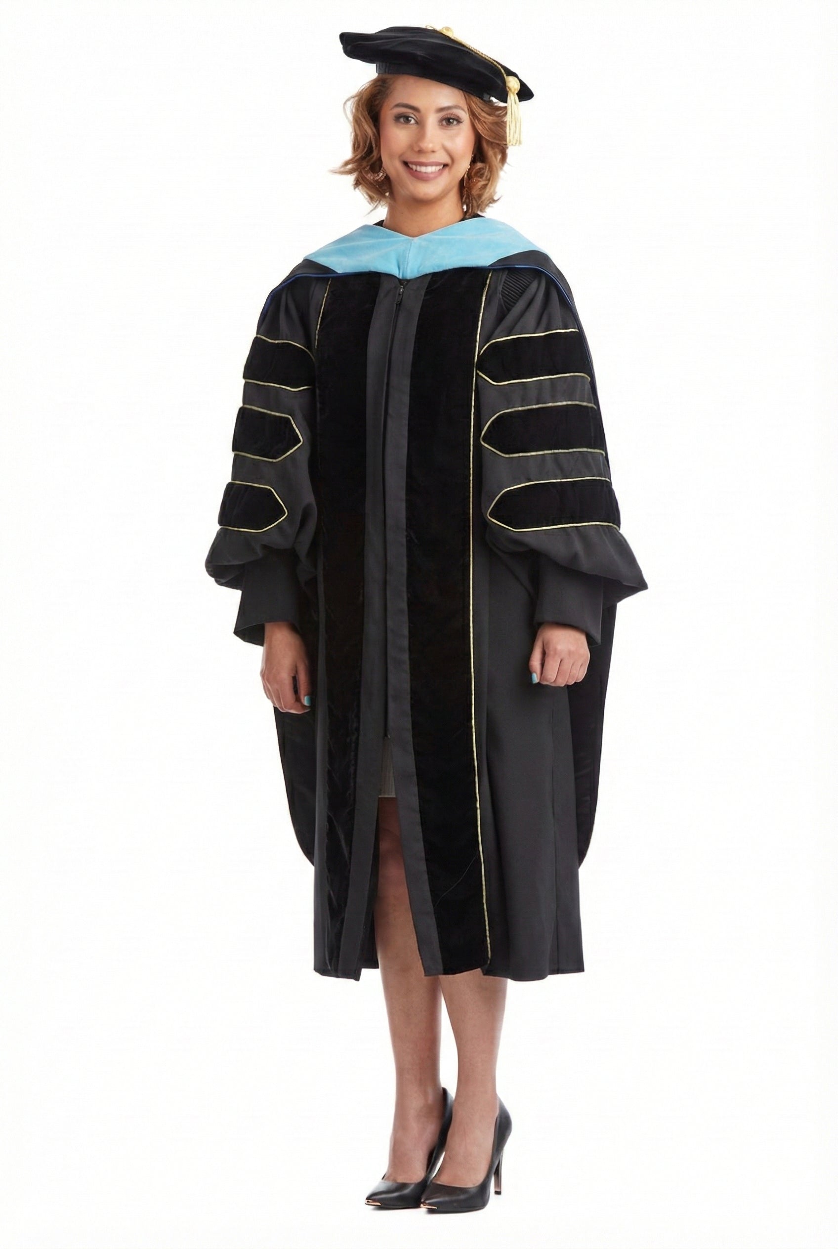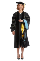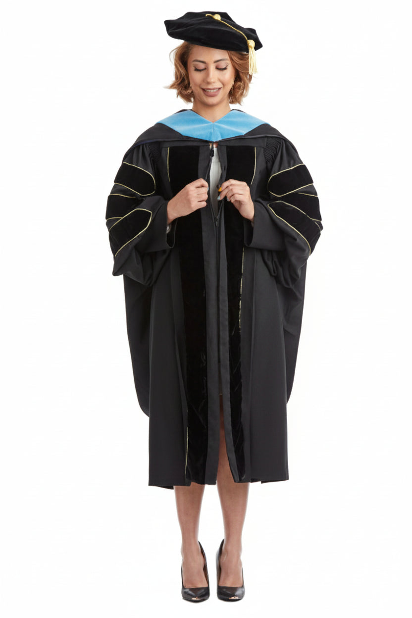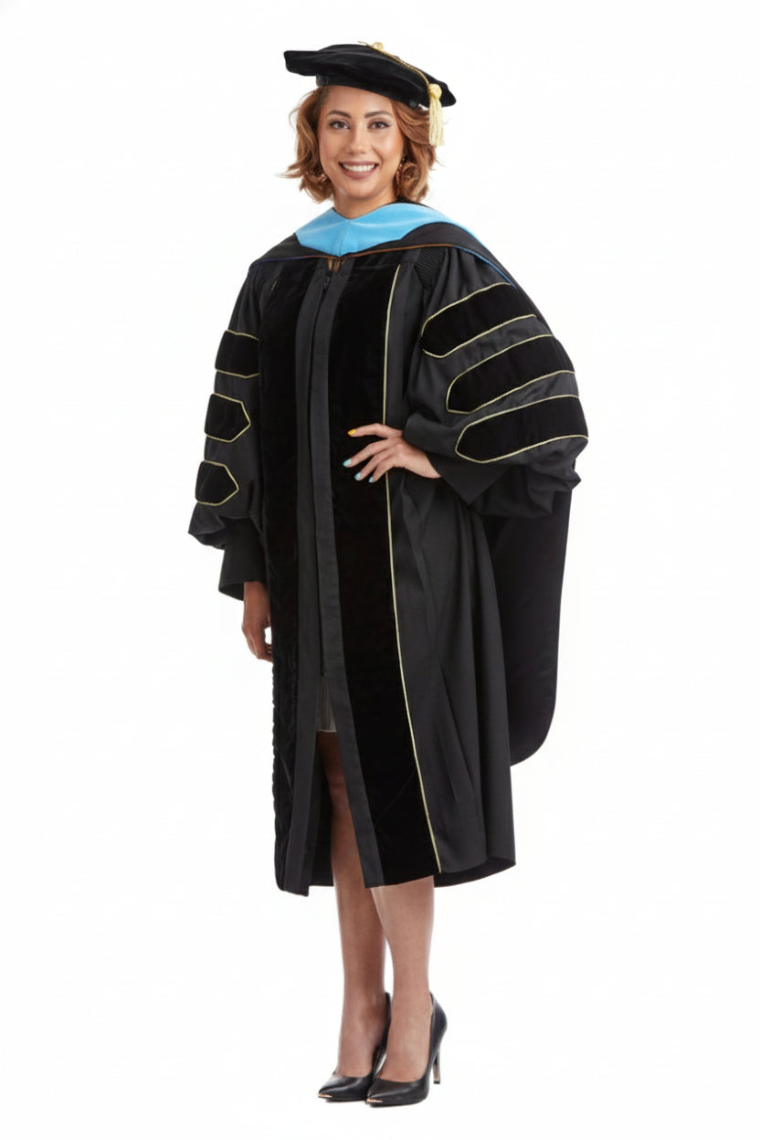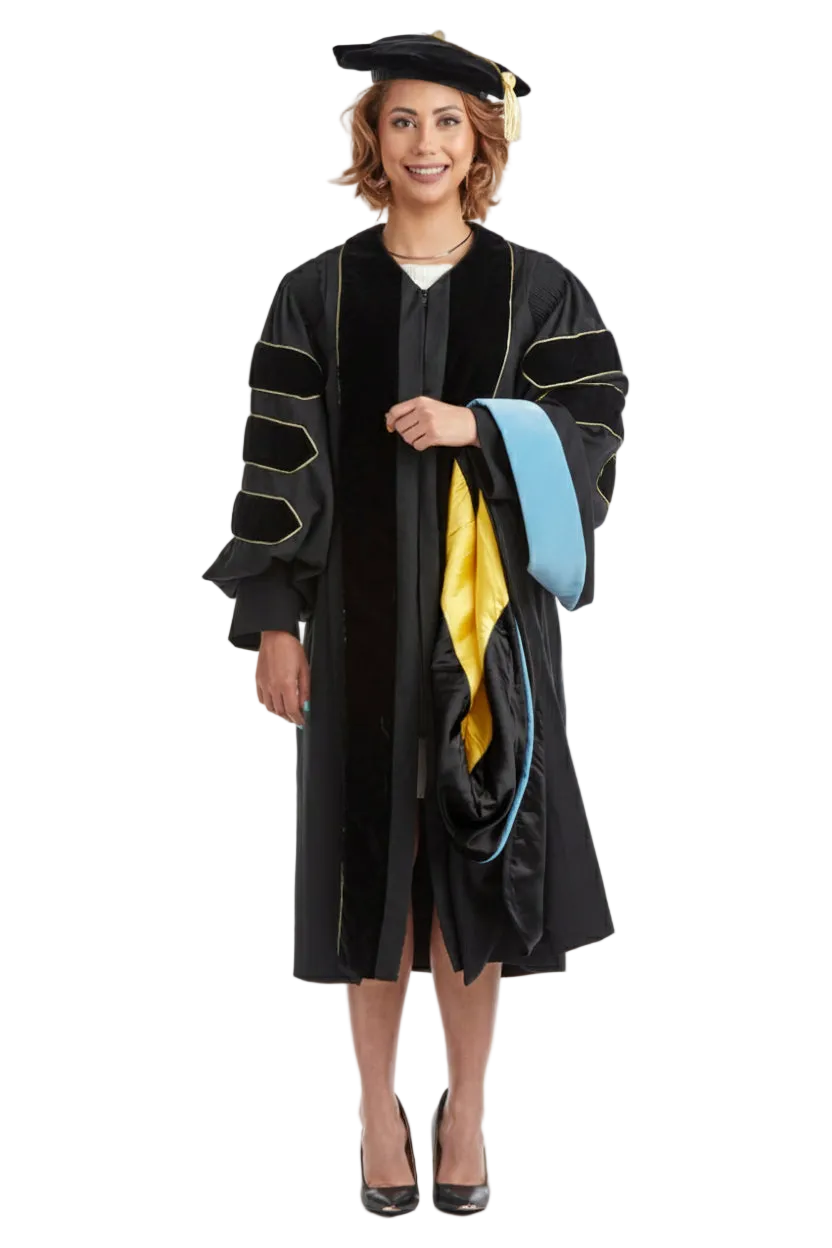 The doctoral hood is trimmed with blue velvet denoting a Ed.D. The interior of the hood; is lined with luxurious black satin and a golden yellow chevron, designed to display your institutional affiliation with Texas Lutheran University. All hoods are 4 feet long.