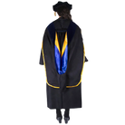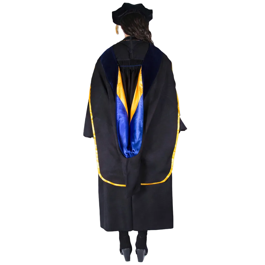 The doctoral hood is trimmed with blue velvet denoting a Ph.D. The interior of the hood; is lined with luxurious yellow satin and UC blue chevron, designed to display your institutional affiliation with UC San Diego. All hoods are 4 feet long.