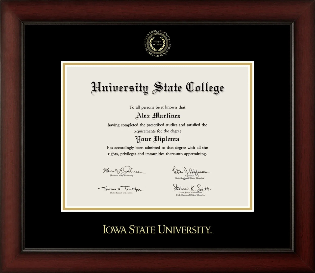The frame showcases museum-quality black and gold matting with your Iowa State University logo and word marks ornately embossed in gold. The significance of such a frame extends beyond mere decoration; it serves as a testament to years of academic dedication and achievement. Iowa State University's distinct design and color scheme for its diploma frames are honored in this set, representing a rich tradition that adds a profound sense of prestige.