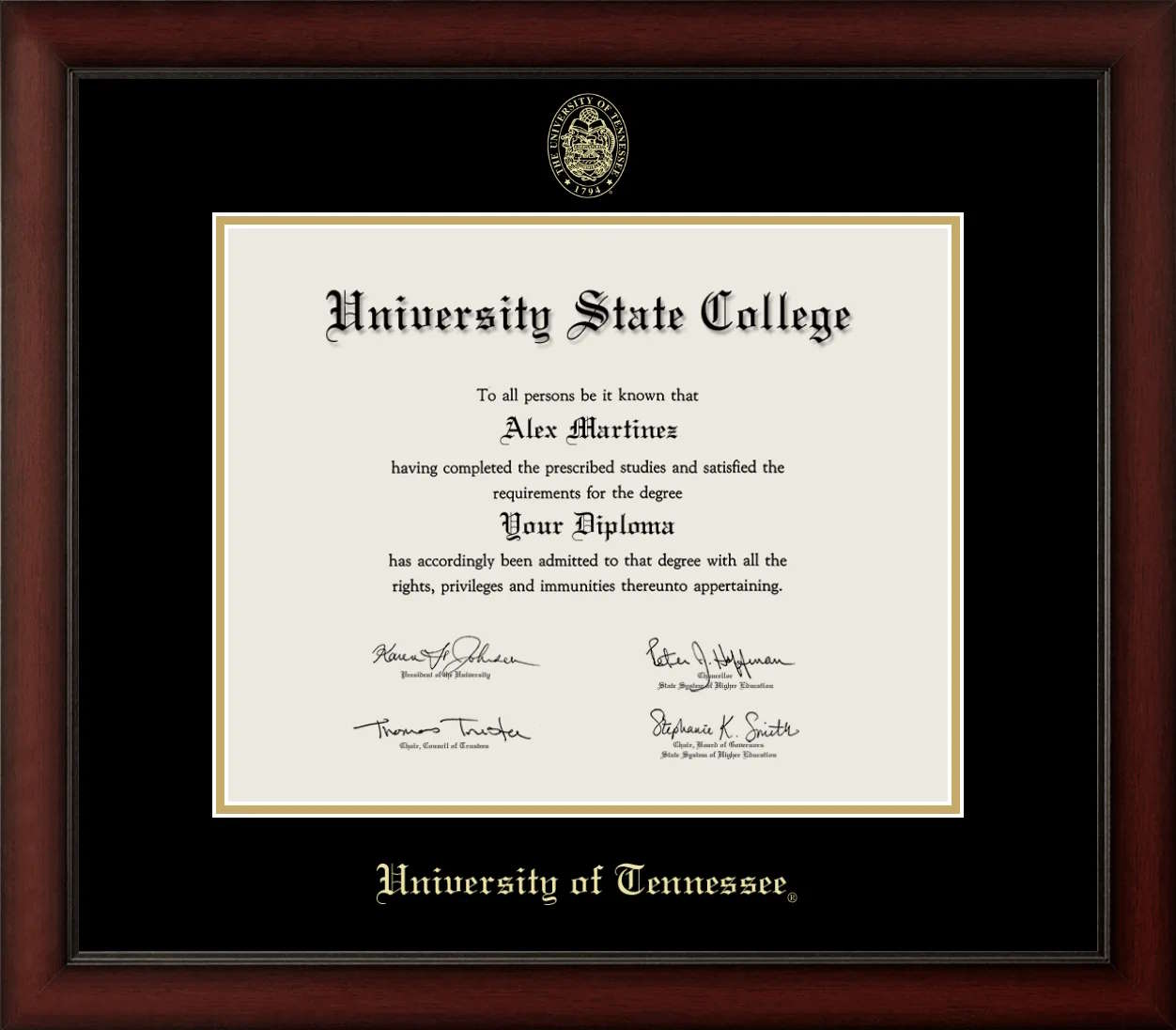 The frame showcases museum-quality black and gold matting with your University of Tennessee logo and word marks ornately embossed in gold. The significance of such a frame extends beyond mere decoration; it serves as a testament to years of academic dedication and achievement. University of Tennessee's distinct design and color scheme for its diploma frames are honored in this set, representing a rich tradition that adds a profound sense of prestige.